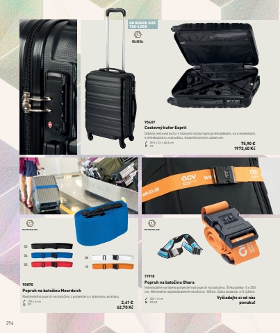 2941006050403ON BOARD SIZETSA-LOCKABS, METAL, POLYESTERPOLYESTER, ABS POLYESTER, ABS95407Cestovn%u00fd kufor EspritOdoln%u00fd cestovn%u00fd kufor s r%u00f4znymii vn%u00fatorn%u00fdmi priehradkami, na 4 kolieskach, s teleskopickou rukov%u00e4%u0165ou, bezpe%u010dnostn%u00fdm uz%u00e1verom.39,5 %u00d7 22 %u00d7 56,5 cm T3 75,90 %u20ac1973,40 K%u010d90870Popruh na bato%u017einu MoordeichNastavite%u013en%u00fd popruh na bato%u017einu z polyesteru s plastovou prackou.193 %u00d7 6 cm S2 2,41 %u20ac62,70 K%u010d71918Popruh na bato%u017einu OharaIndividu%u00e1lne vyroben%u00fd polyesterov%u00fd popruh na bato%u017einu. %u0160%u00edrka p%u00e1sky: 5 x 200 cm. Minim%u00e1lne objedn%u00e1vate%u013en%u00e9 mno%u017estvo: 100 ks. Doba dodania: 4-5 t%u00fd%u017edne.200 %u00d7 5 cm DT,S2Vy%u017eiadajte si od n%u00e1s ponuku!