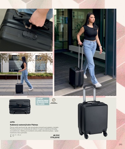 295LAPTOP COMPARTMENTON BOARD SIZETSA-LOCK ABS, METAL, 210 D POLYESTER66956Kabinov%u00fd cestovn%u00fd kufor Palmas%u010cierny voz%u00edk navrhnut%u00fd tak, aby sa pohodlne zmestil pod sedadlo v lietadle. Pon%u00faka priestor pre notebooky do ve%u013ekosti 14 palcov a %u010fal%u0161ie priehradky na osobn%u00e9 veci. Ide%u00e1lny pre slu%u017eobn%u00e9 cesty alebo v%u00edkendov%u00e9 pobyty %u2013 sp%u00e1ja funk%u010dnos%u0165, %u0161t%u00fdl a pohodlie.30 %u00d7 21 %u00d7 35 cm T3 68,10 %u20ac1770,60 K%u010d