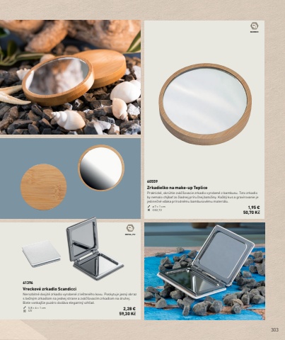 303BAMBOOMETAL, PU61396Vreckov%u00e9 zrkadlo ScandicciNerozbitn%u00e9 dvojit%u00e9 zrkadlo vyroben%u00e9 z le%u0161ten%u00e9ho kovu. Poskytuje jasn%u00fd obraz s be%u017en%u00fdm zrkadlom na jednej strane a zv%u00e4%u010d%u0161ovac%u00edm zrkadlom na druhej. Biele vonkaj%u0161ie puzdro dod%u00e1va elegantn%u00fd vzh%u013ead.5,8 %u00d7 6 %u00d7 1 cm UV 2,28 %u20ac 59,30 K%u010d60559Zrkadielko na make-up TeplicePraktick%u00e9, okr%u00fahle zv%u00e4%u010d%u0161ovacie zrkadlo vyroben%u00e9 z bambusu. Toto zrkadlo by nemalo ch%u00fdba%u0165 zo %u017eiadnej pr%u00edru%u010dnej bato%u017einy. Ka%u017ed%u00fd kus a grav%u00edrovanie je jedine%u010dn%u00e9 v%u010faka pr%u00edrodn%u00e9mu bambusov%u00e9mu materi%u00e1lu.%u00f8 7 %u00d7 1 cm CG2,T2 1,95 %u20ac50,70 K%u010d