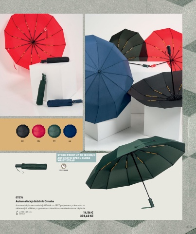 31303 05 99 44190T PONGEESTORM PROOF UP TO 180 KM/HAUTOMATIC OPEN + CLOSEWRIST STRAP07276Automatick%u00fd d%u00e1%u017ednik OmahaAutomatick%u00fd a vetruodoln%u00fd d%u00e1%u017ednik zo 190T polyesteru, s kostrou zo sklenen%u00fdch vl%u00e1kien, s gumenou rukov%u00e4%u0165ou a remienkom na z%u00e1p%u00e4stie.%u00f8 103 %u00d7 65 cm DT,S2 14,56 %u20ac378,60 K%u010d