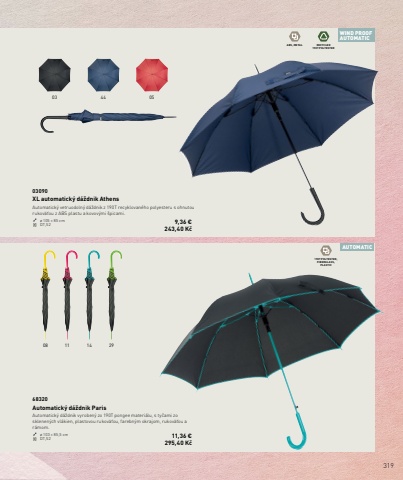 31908 11 14 2903 44 05WIND PROOFAUTOMATIC AUTOMATIC RECYCLED190T POLYESTER68320Automatick%u00fd d%u00e1%u017ednik ParisAutomatick%u00fd d%u00e1%u017ednik vyroben%u00fd zo 190T pongee materi%u00e1lu, s ty%u010dami zo sklenen%u00fdch vl%u00e1kien, plastovou rukov%u00e4%u0165ou, farebn%u00fdm okrajom, rukov%u00e4%u0165ou a r%u00e1mom.%u00f8 103 %u00d7 85,5 cm DT,S2 11,36 %u20ac295,40 K%u010d03090XL automatick%u00fd d%u00e1%u017ednik AthensAutomatick%u00fd vetruodoln%u00fd d%u00e1%u017ednik z 190T recyklovan%u00e9ho polyesteru s ohnutou rukov%u00e4%u0165ou z ABS plastu a kovov%u00fdmi %u0161picami.%u00f8 105 %u00d7 85 cm DT,S2 9,36 %u20ac243,40 K%u010dABS, METAL190T POLYESTER, FIBERGLASS, PLASTIC