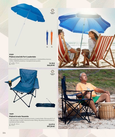 3261004POLYESTER, METALPOLYESTER, METAL97099Pl%u00e1%u017eov%u00fd slne%u010dn%u00edk Fort LauderdaleVe%u013ek%u00fd praktick%u00fd pl%u00e1%u017eov%u00fd slne%u010dn%u00edk z polyesteru s nastavite%u013enou kovovou r%u00fa%u010dkou. D%u00e1%u017ednik je balen%u00fd v transparentnom puzdre.%u00f8 135 %u00d7 170 cm DT,S2 13,10 %u20ac340,60 K%u010d15659Pl%u00e1%u017eov%u00e9 kreslo YosemiteVe%u013emi komfortn%u00e9 pl%u00e1%u017eov%u00e9 skladacie kreslo v modrej farbe. D%u00e1 sa pou%u017ei%u0165 %u010di u%u017e v z%u00e1hrade alebo na pl%u00e1%u017ei. Nosnos%u0165 kresla 150 kg. Na jednej strane kresla sa nach%u00e1dza dr%u017eiak na f%u013ea%u0161u.85 %u00d7 80 %u00d7 50 cm DT,S2 22,97 %u20ac597,20 K%u010d