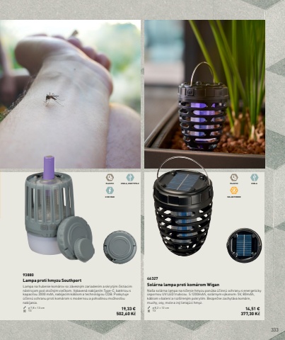 333PLASTIC USB-A, USB TYPE-C2 000 MAHPLASTIC USB-ASOLAR POWER93880Lampa proti hmyzu SouthportLampa na hubenie kom%u00e1rov so z%u00e1vesn%u00fdm zariaden%u00edm a skryt%u00fdm %u010distiacim n%u00e1strojom pod oto%u010dn%u00fdm vie%u010dkom. Vybaven%u00e1 nab%u00edjan%u00edm Type-C, bat%u00e9riou s kapacitou 2000 mAh, nab%u00edjac%u00edm k%u00e1blom a technol%u00f3giou COB. Poskytuje %u00fa%u010dinn%u00fa ochranu proti kom%u00e1rom s modernou a pohodlnou mo%u017enos%u0165ou nab%u00edjania.%u00f8 7,8 %u00d7 13 cm T3 19,33 %u20ac502,60 K%u010d46327Sol%u00e1rna lampa proti kom%u00e1rom WiganNa%u0161a sol%u00e1rna lampa na ni%u010denie hmyzu pon%u00faka %u00fa%u010dinn%u00fa ochranu s energeticky %u00faspornou UV LED trubicou. S 1200mAh, sol%u00e1rnym v%u00fdkonom: 5V, 80mAh, k%u00e1blom v balen%u00ed a roz%u0161%u00edren%u00fdm pokryt%u00edm. Bezpe%u010dne zachyt%u00e1va kom%u00e1re, muchy, osy, mole a in%u00fd lietaj%u00faci hmyz.%u00f8 8,2 %u00d7 12 cm T3 14,51 %u20ac377,30 K%u010d