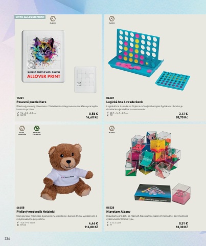 336PLUSH, PLASTICPOLYESTERPLASTIC PLASTICRECYCLED POLYESTERCMYK ALLOVER PRINT06369Logick%u00e1 hra 4 v rade GenkLogick%u00e1 hra 4 v rade so %u017elt%u00fdmi a ru%u017eov%u00fdmi hern%u00fdmi fig%u00farkami. Ihrisko je skladacie a je ide%u00e1lne na cestovanie.20,7 %u00d7 14,9 %u00d7 2,9 cm T2 3,41 %u20ac88,70 K%u010d84528Hlavolam AlbanyHlavolamy pre deti. 24 r%u00f4znych hlavolamov, balen%u00e9 hromadne, bez mo%u017enosti v%u00fdberu konkr%u00e9tneho typu.4 %u00d7 4 %u00d7 4 cm T1 0,51 %u20ac13,30 K%u010d11201Posuvn%u00e9 puzzle HaroPlastov%u00fd posuvn%u00fd hlavolam s 15 dielikmi a integrovanou zar%u00e1%u017ekou pre lep%u0161iu kontrolu pri hre.7,4 %u00d7 0,5 %u00d7 8,8 cm UV,T2 0,56 %u20ac14,60 K%u010d66608Ply%u0161ov%u00fd medved%u00edk HelsinkiMal%u00fd ply%u0161ov%u00fd medved%u00edk z polyesteru, oble%u010den%u00fd v bielom tri%u010dku vyrobenom z recyklovan%u00e9ho polyesteru.14,5 %u00d7 9 %u00d7 16 cm DT,S2 4,46 %u20ac 116,00 K%u010d