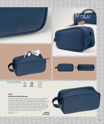 252 YEARWARRANTYNYLON, PU COATINGHIGH QUALITY MATERIALSWATER REPELLENT23009Kozmetick%u00e1 ta%u0161ka SanremoObjavte dokonal%u00fa kombin%u00e1ciu %u0161t%u00fdlu a funk%u010dnosti s na%u0161ou vysokokvalitnou kozmetickou ta%u0161kou z nylonu (s PU povrchom). T%u00e1to elegantn%u00e1 ta%u0161ka poskytuje dostatok priestoru pre v%u0161etky va%u0161e kozmetick%u00e9 potreby a doplnky a je vybaven%u00e1 robustn%u00fdm zipsom, ktor%u00fd zais%u0165uje dodato%u010dn%u00fa bezpe%u010dnos%u0165. Dve praktick%u00e9 p%u00fatka v%u00e1m umo%u017e%u0148uj%u00fa pohodlne zavesi%u0165 ta%u0161ku - ide%u00e1lne pre pou%u017eitie doma alebo na cest%u00e1ch. Decentn%u00e9 ozna%u010denie zna%u010dky Molu dod%u00e1va kozmetickej ta%u0161ke exkluz%u00edvny n%u00e1dych bez toho, aby p%u00f4sobilo vtieravo. T%u00e1to kozmetick%u00e1 ta%u0161ka nie je len praktick%u00fdm spolo%u010dn%u00edkom, ale aj %u0161t%u00fdlov%u00fdm doplnkom, ktor%u00fd prezentuje va%u0161u zna%u010dku v elegantnom svetle.26 %u00d7 10 %u00d7 13 cm DT,S2 28,90 %u20ac751,40 K%u010d