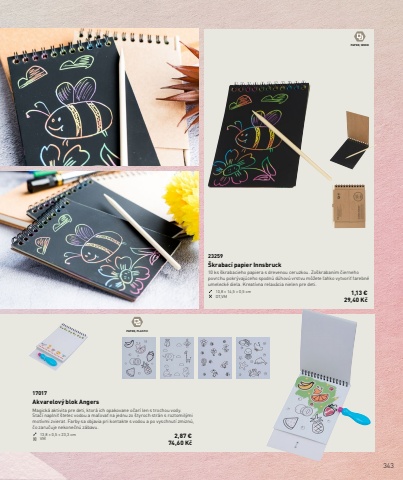 343PAPER, WOODPAPER, PLASTIC23259%u0160krabac%u00ed papier Innsbruck10 ks %u0161krabacieho papiera s drevenou ceruzkou. Zo%u0161kraban%u00edm %u010dierneho povrchu pokr%u00fdvaj%u00faceho spodn%u00fa d%u00fahov%u00fa vrstvu m%u00f4%u017eete %u013eahko vytvori%u0165 farebn%u00e9 umeleck%u00e9 diela. Kreat%u00edvna relax%u00e1cia nielen pre deti.10,8 %u00d7 14,5 %u00d7 0,5 cm DT,VM 1,13 %u20ac29,40 K%u010d17017Akvarelov%u00fd blok AngersMagick%u00e1 aktivita pre deti, ktor%u00e1 ich opakovane o%u010dar%u00ed len s trochou vody. Sta%u010d%u00ed naplni%u0165 %u0161tetec vodou a ma%u013eova%u0165 na jednu zo %u0161tyroch str%u00e1n s roztomil%u00fdmi mot%u00edvmi zvierat. Farby sa objavia pri kontakte s vodou a po vyschnut%u00ed zmizn%u00fa, %u010do zaru%u010duje nekone%u010dn%u00fa z%u00e1bavu.13,8 %u00d7 0,5 %u00d7 23,3 cm VM 2,87 %u20ac 74,60 K%u010d