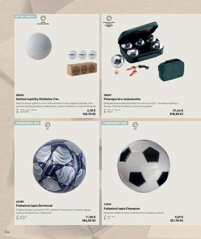 344RESIN, NATURAL RUBBERPVC PVCSTAINLESS STEEL, PLASTIC, POLYESTER, WOODSET OF 3 BALLSTOURNAMENT SIZE TOURNAMENT SIZE98687Petanque hra JacksonvilleVe%u013ek%u00e1 petanque sada pozost%u00e1va zo 6 kovov%u00fdch g%u00fa%u013e, 1 drevenej lopti%u010dky a %u0161n%u00farky. Cel%u00fd set je balen%u00fd v nylonovom puzdre.23 %u00d7 7 %u00d7 16 cm DT,S2 31,46 %u20ac818,00 K%u010d08045Golfov%u00e9 lopti%u010dky Hilzhofen 3 ksNavrhnut%u00e9 pre golfistov, ktor%u00ed t%u00fa%u017eia dosiahnu%u0165 svoj najlep%u0161%u00ed v%u00fdsledok, tieto golfov%u00e9 lopti%u010dky poskytuj%u00fa m%u00e4kk%u00fd %u00fader, vysok%u00fa trajekt%u00f3riu a v%u00fdnimo%u010dn%u00fd dolet.13,5 %u00d7 4,5 %u00d7 4,5 cm UV,T2,VM 6,18 %u20ac160,70 K%u010d14545Futbalov%u00e1 lopta ChampionKlasick%u00e1 futbalov%u00e1 lopta v %u0161tandardnej turnajovej ve%u013ekosti.%u00f8 21 cm T3 9,69 %u20ac251,90 K%u010d65389Futbalov%u00e1 lopta DortmundFutbalov%u00e1 lopta vyroben%u00e1 z PVC, ve%u013ekos%u0165 5 vhodn%u00e1 pre turnajov%u00e9 z%u00e1pasy. Lopta je dod%u00e1van%u00e1 bez naf%u00faknutia.%u00f8 20 cm DT,S2 11,00 %u20ac286,00 K%u010d