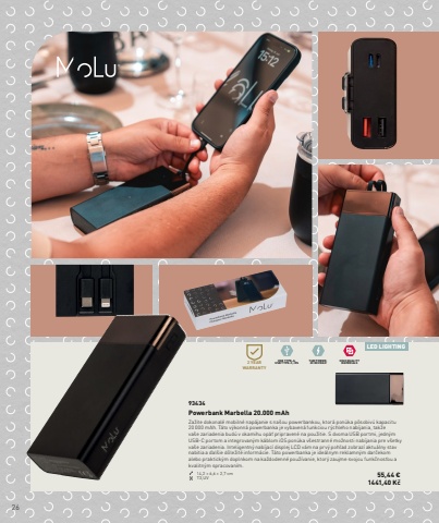 26LED LIGHTINGUSB TYPE-A, USB TYPE-C, iOS74W POWER,20 000 MAHHIGH QUALITY 2 YEAR MATERIALSWARRANTY93434Powerbank Marbella 20.000 mAhZa%u017eite dokonal%u00e9 mobiln%u00e9 nap%u00e1janie s na%u0161ou powerbankou, ktor%u00e1 pon%u00faka p%u00f4sobiv%u00fa kapacitu 20 000 mAh. T%u00e1to v%u00fdkonn%u00e1 powerbanka je vybaven%u00e1 funkciou r%u00fdchleho nab%u00edjania, tak%u017ee va%u0161e zariadenia bud%u00fa v okamihu op%u00e4%u0165 pripraven%u00e9 na pou%u017eitie. S dvoma USB portmi, jedn%u00fdm USB-C portom a integrovan%u00fdm k%u00e1blom iOS pon%u00faka v%u0161estrann%u00e9 mo%u017enosti nab%u00edjania pre v%u0161etky va%u0161e zariadenia. Inteligentn%u00fd nab%u00edjac%u00ed displej LCD v%u00e1m na prv%u00fd poh%u013ead zobraz%u00ed aktu%u00e1lny stav nabitia a %u010fal%u0161ie d%u00f4le%u017eit%u00e9 inform%u00e1cie. T%u00e1to powerbanka je ide%u00e1lnym reklamn%u00fdm dar%u010dekom alebo praktick%u00fdm doplnkom na ka%u017edodenn%u00e9 pou%u017e%u00edvanie, ktor%u00fd zaujme svojou funk%u010dnos%u0165ou a kvalitn%u00fdm spracovan%u00edm.14,2 %u00d7 6,6 %u00d7 2,7 cm T3,UV 55,44 %u20ac 1441,40 K%u010d