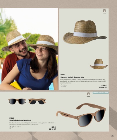 353STRAWPLASTIC400 UV PROTECTION10619Slamen%u00fd klob%u00fak SummersideNadchnite svojich klientov s t%u00fdmto elegantn%u00fdm slamen%u00fdm klob%u00fakom. M%u00e1 potn%u00fd p%u00e1sik na vn%u00fatornej strane. V%u010faka svojmu neutr%u00e1lnemu tvaru ho m%u00f4%u017eu nosi%u0165 mu%u017ei aj %u017eeny.%u00f8 36 cm DT,S2 4,64 %u20ac 120,60 K%u010d31042Slne%u010dn%u00e9 okuliare WoodlookSlne%u010dn%u00e9 okuliare vyroben%u00e9 z plastu s efektom dreva, vybaven%u00e9 %u0161o%u0161ovkami s certifik%u00e1ciou UV400 pre optim%u00e1lnu ochranu o%u010d%u00ed.14,5 %u00d7 15 %u00d7 4,8 cm T2 1,85 %u20ac48,10 K%u010d