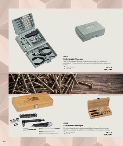 36060817Sada n%u00e1radia ManaguaT%u00e1to 25-dielna sada n%u00e1strojov obsahuje v%u0161etky druhy n%u00e1radia, ktor%u00e9 potrebujete. Vyroben%u00e9 z kvalitn%u00e9ho materi%u00e1lu ulo%u017een%u00e9 v malom plastovom kufr%u00edku.15,5 %u00d7 10 %u00d7 5 cm T3,G3,DO 11,36 %u20ac295,40 K%u010d25258Sada n%u00e1radia Beringen21-dielna sada n%u00e1radia pozost%u00e1vaj%u00faca z 3 skrutkova%u010dov, r%u00f4znych bitov s adapt%u00e9rom, ako aj fr%u00e9zy a 4 %u0161es%u0165hrann%u00fdch k%u013e%u00fa%u010dov v bambusovom kufr%u00edku.22 %u00d7 11 %u00d7 3,5 cm CG3,T3 18,41 %u20ac478,70 K%u010d