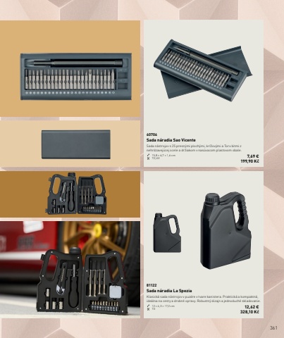 36181122Sada n%u00e1radia La SpeziaKlasick%u00e1 sada n%u00e1strojov v puzdre v tvare kanistera. Praktick%u00e1 a kompaktn%u00e1, ide%u00e1lna na cesty a drobn%u00e9 opravy. Robustn%u00fd dizajn a jednoduch%u00e9 skladovanie.12 %u00d7 4,3 %u00d7 17,2 cm T3 12,62 %u20ac328,10 K%u010d60706Sada n%u00e1radia Sao VicenteSada n%u00e1strojov s 25 presn%u00fdmi ploch%u00fdmi, kr%u00ed%u017eov%u00fdmi a Torx bitmi z nehrdzavej%u00facej ocele a dr%u017eiakom v nas%u00favacom plastovom obale.15,8 %u00d7 6,7 %u00d7 1,6 cm T2,UV 7,69 %u20ac199,90 K%u010d