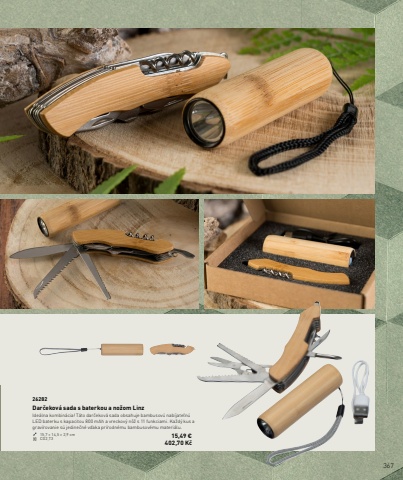 36726282Dar%u010dekov%u00e1 sada s baterkou a no%u017eom LinzIde%u00e1lna kombin%u00e1cia! T%u00e1to dar%u010dekov%u00e1 sada obsahuje bambusov%u00fa nab%u00edjate%u013en%u00fa LED baterku s kapacitou 800 mAh a vreckov%u00fd n%u00f4%u017e s 11 funkciami. Ka%u017ed%u00fd kus a grav%u00edrovanie s%u00fa jedine%u010dn%u00e9 v%u010faka pr%u00edrodn%u00e9mu bambusov%u00e9mu materi%u00e1lu.15,7 %u00d7 14,5 %u00d7 2,9 cm CG2,T3 15,49 %u20ac402,70 K%u010d