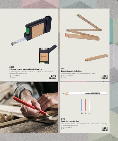 373060504PROMO FORCE78247Skladac%u00ed meter St. GallenDreven%u00fd skladac%u00ed meter s rozsahom merania a%u017e 2 metre.23,7 %u00d7 2,9 %u00d7 1,6 cm T2,UV 3,79 %u20ac98,50 K%u010d31114Tes%u00e1rska ceruzka KentVe%u013ek%u00e1 tes%u00e1rska ceruzka s dreven%u00fdm povrchom a grafitovou tuhou. Ceruzky s%u00fa dod%u00e1van%u00e9 nezastr%u00fahan%u00e9.17,7 %u00d7 1 %u00d7 0,6 cm T1 0,21 %u20ac5,50 K%u010d26268Zvinovac%u00ed meter s vodov%u00e1hou Halifax 3 m3-metrov%u00e9 plastov%u00e9 meradlo s vodov%u00e1hou, poistn%u00fdm tla%u010didlom a piatimi vymenite%u013en%u00fdmi nadstavcami.9,7 %u00d7 2 %u00d7 5,8 cm CG2,T2 2,77 %u20ac72,00 K%u010d