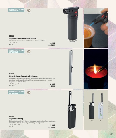 38903 06ADJUSTABLE FLAMEREFILLABLE ADJUSTABLE FLAMEREFILLABLE ADJUSTABLE FLAMEREFILLABLE PLASTIC, METALPLASTIC, METALPLASTIC, METAL85844Zapa%u013eova%u010d na flambovanie PesaroPlnite%u013en%u00fd plynov%u00fd hor%u00e1k na flambovanie s detskou poistkou.6 %u00d7 3,5 %u00d7 11,2 cm T2 4,18 %u20ac108,70 K%u010d43469Kovov%u00fd plynov%u00fd zapa%u013eova%u010d BrisbaneTenk%u00fd plynov%u00fd zapa%u013eova%u010d je ide%u00e1lny na bezpe%u010dn%u00e9 zapa%u013eovanie svie%u010dok, grilov, petrolejov%u00fdch l%u00e1mp a r%u00f4znych %u010fal%u0161%u00edch predmetov. Je plnite%u013en%u00fd a p%u00f4sob%u00ed elegantne na ka%u017edom stole.17,6 %u00d7 1,5 %u00d7 1,1 cm G2,T2 4,38 %u20ac 113,90 K%u010d61053Zapa%u013eova%u010d BejingElektronick%u00fd zapa%u013eova%u010d s %u010diernou hlavou a pr%u00fadov%u00fdm plame%u0148om, opakovane naplnite%u013en%u00fd. Ve%u013ekos%u0165 plame%u0148a je mo%u017en%u00e9 plynule regulova%u0165.2,5 %u00d7 1,18 %u00d7 12,2 cm T2 1,03 %u20ac26,80 K%u010d