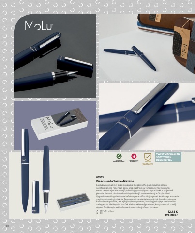 30RECYCLED STAINLESS STEELHIGH QUALITY MATERIALS 2 YEARWARRANTYTWIST MECHANISMSOFT TOUCHBLUE REFILL05553P%u00edsacia sada Sainte-MaximeExkluz%u00edvny p%u00edsac%u00ed set pozost%u00e1vaj%u00faci z elegantn%u00e9ho gu%u013e%u00f4%u010dkov%u00e9ho pera a sofistikovan%u00e9ho rollerball pera. Oba n%u00e1stroje s%u00fa vyroben%u00e9 z recyklovanej nehrdzavej%u00facej ocele a maj%u00fa pohodln%u00fd gumov%u00fd povrch pre %u013eahk%u00e9 a pr%u00edjemn%u00e9 p%u00edsanie. Jemn%u00e9, chr%u00f3mov%u00e9 ozdoby dod%u00e1vaj%u00fa sade modern%u00fd a %u010dist%u00fd vzh%u013ead. Vygrav%u00edrovan%u00e9 logo MoLu na ka%u017edom pere zd%u00f4raz%u0148uje vysok%u00fa kvalitu spracovania a exkluzivitu tejto kolekcie. Tento p%u00edsac%u00ed set nie je len praktick%u00fdm n%u00e1strojom na ka%u017edodenn%u00e9 pou%u017eitie, ale aj %u0161t%u00fdlov%u00fdm doplnkom, ktor%u00fd vyjadruje profesionalitu a eleganciu. Ide%u00e1lny ako dar%u010dek alebo reklamn%u00fd predmet, ktor%u00fd zanech%u00e1 trval%u00fd dojem. Dod%u00e1van%u00fd v exkluz%u00edvnom balen%u00ed s dvojro%u010dnou z%u00e1rukou.17,7 %u00d7 7,1 %u00d7 3 cm G3 12,46 %u20ac324,00 K%u010d