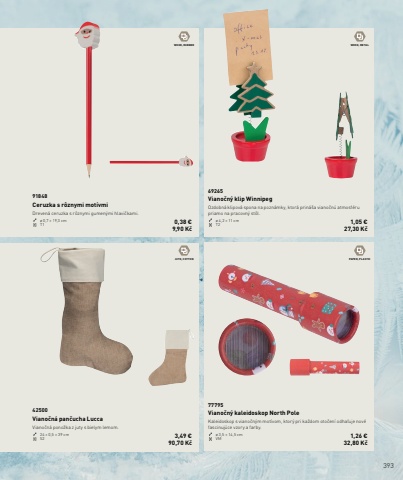 393WOOD, RUBBERJUTE, COTTON PAPER, PLASTICWOOD, METAL91848Ceruzka s r%u00f4znymi mot%u00edvmiDreven%u00e1 ceruzka s r%u00f4znymi gumen%u00fdmi hlavi%u010dkami.%u00f8 0,7 %u00d7 19,3 cm T1 0,38 %u20ac 9,90 K%u010d69265Viano%u010dn%u00fd klip WinnipegOzdobn%u00e1 klipov%u00e1 spona na pozn%u00e1mky, ktor%u00e1 prin%u00e1%u0161a viano%u010dn%u00fa atmosf%u00e9ru priamo na pracovn%u00fd st%u00f4l.%u00f8 4,2 %u00d7 11 cm T2 1,05 %u20ac27,30 K%u010d77795Viano%u010dn%u00fd kaleidoskop North PoleKaleidoskop s viano%u010dn%u00fdm mot%u00edvom, ktor%u00fd pri ka%u017edom oto%u010den%u00ed odha%u013euje nov%u00e9 fascinuj%u00face vzory a farby.%u00f8 3,5 %u00d7 14,5 cm VM 1,26 %u20ac32,80 K%u010d42500Viano%u010dn%u00e1 pan%u010ducha LuccaViano%u010dn%u00e1 pono%u017eka z juty s bielym lemom.24 %u00d7 0,5 %u00d7 39 cm S2 3,49 %u20ac90,70 K%u010d