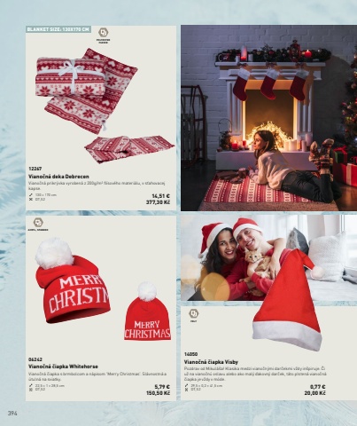 394BLANKET SIZE: 130X170 CMPOLYESTER FLEECEACRYL, SPANDEXFELT14050Viano%u010dn%u00e1 %u010diapka VisbyPozdrav od Mikul%u00e1%u0161a! Klasika medzi viano%u010dn%u00fdmi dar%u010dekmi v%u017edy in%u0161piruje. %u010ci u%u017e na viano%u010dn%u00fa oslavu alebo ako mal%u00fd %u010fakovn%u00fd dar%u010dek, t%u00e1to plsten%u00e1 viano%u010dn%u00e1 %u010diapka je v%u017edy v m%u00f3de.29,5 %u00d7 0,2 %u00d7 41,5 cm DT,S2 0,77 %u20ac20,00 K%u010d06242Viano%u010dn%u00e1 %u010diapka WhitehorseViano%u010dn%u00e1 %u010diapka s brmbolcom a n%u00e1pisom 'Merry Christmas'. Sl%u00e1vnostn%u00e1 a %u00fatuln%u00e1 na sviatky.22,5 %u00d7 1 %u00d7 28,5 cm DT,S2 5,79 %u20ac150,50 K%u010d12267Viano%u010dn%u00e1 deka DebrecenViano%u010dn%u00e1 prikr%u00fdvka vyroben%u00e1 z 200g/m%u00b2 fl%u00edsov%u00e9ho materi%u00e1lu, v s%u0165ahovacej kapse.130 %u00d7 170 cm DT,S2 14,51 %u20ac377,30 K%u010d
