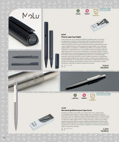 322 YEARWARRANTY2 YEARWARRANTYRECYCLED ALUMINIUMHIGH QUALITY MATERIALSBLUE REFILLRECYCLED STAINLESS STEELHIGH QUALITY MATERIALSBIG BLUE REFILL83709P%u00edsacia sada Cap d'AgdeTento p%u00edsac%u00ed set, ktor%u00fd obsahuje elegantn%u00e9 gu%u013e%u00f4%u010dkov%u00e9 pero s oto%u010dn%u00fdm mechanizmom a %u0161t%u00fdlov%u00e9 rollerov%u00e9 pero (obe s modr%u00fdm atramentom), vynik%u00e1 svoj%u00edm v%u00fdnimo%u010dn%u00fdm trojuholn%u00edkov%u00fdm tvarom, ktor%u00fd nie je len esteticky pr%u00ed%u0165a%u017eliv%u00fd, ale aj ergonomicky navrhnut%u00fd pre optim%u00e1lne pohodlie v ruke. Jedine%u010dn%u00fd dizajn, vyvinut%u00fd pod%u013ea princ%u00edpov zlat%u00e9ho rezu, dokonale sp%u00e1ja estetiku s ergon%u00f3miou. Gu%u013e%u00f4%u010dkov%u00e9 per%u00e1 MoLu s%u00fa vyroben%u00e9 z vysoko kvalitn%u00e9ho recyklovan%u00e9ho kovu, %u010do im dod%u00e1va rafinovan%u00fd vzh%u013ead a z%u00e1rove%u0148 zabezpe%u010duje odolnos%u0165 a pevnos%u0165. Ka%u017ed%u00e9 pero je vybaven%u00e9 n%u00e1pl%u0148ou Parker s ve%u013ekou kapacitou, ktor%u00e1 poskytuje konzistentn%u00fd a pohodln%u00fd z%u00e1%u017eitok z p%u00edsania. Pero MoLu je dostupn%u00e9 ako gu%u013e%u00f4%u010dkov%u00e9 aj rollerov%u00e9, %u010do umo%u017e%u0148uje v%u00fdber p%u00edsacieho n%u00e1stroja pod%u013ea va%u0161ich potrieb. V%u010faka mechanizmu na dop%u013a%u0148anie je mo%u017en%u00e9 n%u00e1plne jednoducho vymeni%u0165, tak%u017ee si m%u00f4%u017eete svoje ob%u013e%u00faben%u00e9 pero u%u017e%u00edva%u0165 opakovane. %u010ci u%u017e v kancel%u00e1rii, %u0161kole alebo na osobn%u00e9 pozn%u00e1mky, p%u00edsac%u00ed set MoLu je ide%u00e1lnym spolo%u010dn%u00edkom pre t%u00fdch, ktor%u00ed ocenia kvalitu a dizajn. Dod%u00e1van%u00e9 v exkluz%u00edvnom balen%u00ed s dvojro%u010dnou z%u00e1rukou.17,7 %u00d7 7,1 %u00d7 3 cm G3 17,44 %u20ac453,40 K%u010d16430Nerezov%u00e9 gu%u013e%u00f4%u010dkov%u00e9 pero Cape CoralElegantn%u00e9 gu%u013e%u00f4%u010dkov%u00e9 pero MoLu zo strieborn%u00e9ho kovu vynik%u00e1 svoj%u00edm prvotriednym spracovan%u00edm z recyklovan%u00e9ho kovu a matn%u00fdm br%u00fasen%u00fdm povrchom, ktor%u00fd mu dod%u00e1va luxusn%u00fd vzh%u013ead aj pr%u00edjemn%u00fd dotyk. Chr%u00f3mov%u00fd klip a mechanizmus na cvaknutie prid%u00e1vaj%u00fa dizajnu %u010fal%u0161iu d%u00e1vku sofistikovanosti a funk%u010dnosti. V%u010faka n%u00e1plni Parker s ve%u013ekou kapacitou poskytuje pero MoLu plynul%u00fd a pohodln%u00fd z%u00e1%u017eitok z p%u00edsania, ide%u00e1lny pre dlh%u00e9 p%u00edsanie. Vymenite%u013en%u00e1 n%u00e1pl%u0148 umo%u017e%u0148uje jednoduch%u00fa v%u00fdmenu atramentovej kazety, %u010d%u00edm pero zost%u00e1va spo%u013eahliv%u00fdm a trv%u00e1cnym spolo%u010dn%u00edkom. Dod%u00e1van%u00e9 v exkluz%u00edvnom dar%u010dekovom balen%u00ed s dvojro%u010dnou z%u00e1rukou.17,7 %u00d7 3,5 %u00d7 3 cm G3 4,23 %u20ac 110,00 K%u010d