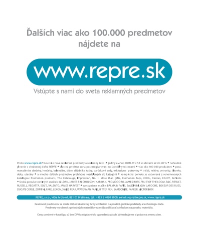 REKLAMN%u00c9 PREDMETY A TEXTILrepre.skFarebnos%u0165 predmetov sa m%u00f4%u017ee l%u00ed%u0161i%u0165 od skuto%u010dnej farby vzh%u013eadom na pou%u017eit%u00e9 graflck%u00e9 podklady a technol%u00f3giu tla%u010de.Predmety vyroben%u00e9 z pr%u00edrodn%u00fdch materi%u00e1lov sa m%u00f4%u017eu odli%u0161ova%u0165 vzh%u013eadom na povahu materi%u00e1lu.Ceny uveden%u00e9 v katal%u00f3gu s%u00fa bez DPH a s%u00fa platn%u00e9 do vypredania z%u00e1sob. Vyhradzujeme si pr%u00e1vo na zmenu cien.
