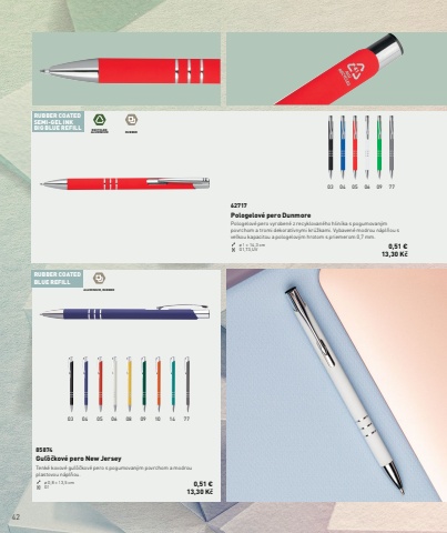 4277090605040303 04 0605 08 1009 7714RUBBER COATEDSEMI-GEL INKBIG BLUE REFILL RECYCLEDALUMINIUMRUBBER COATEDBLUE REFILLRUBBERALUMINIUM, RUBBER62717Pologelov%u00e9 pero DunmorePologelov%u00e9 pero vyroben%u00e9 z recyklovan%u00e9ho hlin%u00edka s pogumovan%u00fdm povrchom a tromi dekorat%u00edvnymi kr%u00fa%u017ekami. Vybaven%u00e9 modrou n%u00e1pl%u0148ou s ve%u013ekou kapacitou a pologelov%u00fdm hrotom s priemerom 0,7 mm.%u00f8 1 %u00d7 14,3 cm G1,T3,UV 0,51 %u20ac13,30 K%u010d85874Gu%u013e%u00f4%u010dkov%u00e9 pero New JerseyTenk%u00e9 kovov%u00e9 gu%u013e%u00f4%u010dkov%u00e9 pero s pogumovan%u00fdm povrchom a modrou plastovou n%u00e1pl%u0148ou.%u00f8 0,8 %u00d7 13,5 cm G1 0,51 %u20ac13,30 K%u010d