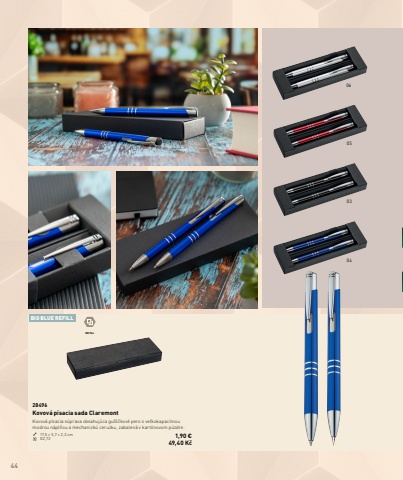 4406050304BIG BLUE REFILLMETAL28496Kovov%u00e1 p%u00edsacia sada ClaremontKovov%u00e1 p%u00edsacia s%u00faprava obsahuj%u00faca gu%u013e%u00f4%u010dkov%u00e9 pero s ve%u013ekokapacitnou modrou n%u00e1pl%u0148ou a mechanick%u00fa ceruzku, zabalen%u00e1 v kart%u00f3novom p%u00fazdre.17,5 %u00d7 5,7 %u00d7 2,2 cm G2,T2 1,90 %u20ac49,40 K%u010d