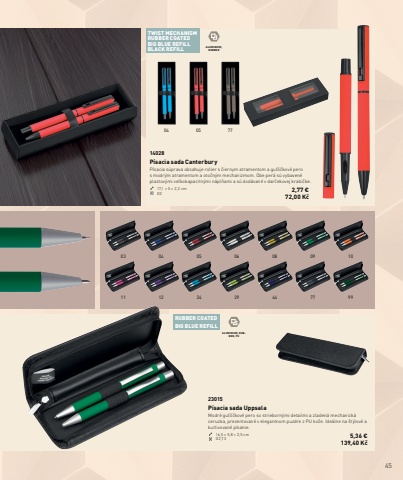 4512 24 29 44 77 9903 04 05 06 08 09 1004 05 7711TWIST MECHANISMRUBBER COATEDBIG BLUE REFILLBLACK REFILLRUBBER COATEDBIG BLUE REFILLALUMINIUM,RUBBERALUMINIUM, RUBBER, PU23015P%u00edsacia sada UppsalaModr%u00e9 gu%u013e%u00f4%u010dkov%u00e9 pero so strieborn%u00fdmi detailmi a zladen%u00e1 mechanick%u00e1 ceruzka, prezentovan%u00e9 v elegantnom puzdre z PU ko%u017ee. Ide%u00e1lne na %u0161t%u00fdlov%u00e9 a kultivovan%u00e9 p%u00edsanie.16,5 %u00d7 5,8 %u00d7 2,5 cm G2,T3 5,36 %u20ac 139,40 K%u010d14028P%u00edsacia sada CanterburyP%u00edsacia s%u00faprava obsahuje roller s %u010diernym atramentom a gu%u013e%u00f4%u010dkov%u00e9 pero s modr%u00fdm atramentom a oto%u010dn%u00fdm mechanizmom. Obe per%u00e1 s%u00fa vybaven%u00e9 plastov%u00fdmi ve%u013ekokapacitn%u00fdmi n%u00e1pl%u0148ami a s%u00fa dod%u00e1van%u00e9 v dar%u010dekovej krabi%u010dke.17,1 %u00d7 5 %u00d7 2,2 cm G2 2,77 %u20ac72,00 K%u010d