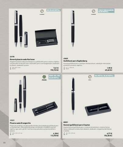 46BIG BLUE REFILL TWIST MECHANISMBLUE REFILLBIG METAL BLUE REFILLALUMINUM ALUMINUMMETALSEMI-GEL INKBLUE REFILL RECYCLEDALUMINIUM49609Gu%u013e%u00f4%u010dkov%u00e9 pero KapfenbergKovov%u00e9 gu%u013e%u00f4%u010dkov%u00e9 pero s oto%u010dn%u00fdm mechanizmom, ozdobn%u00fdm rebrovan%u00fdm prste%u0148om a modrou n%u00e1pl%u0148ou.%u00f8 1,1 %u00d7 13,6 cm G2,T2 1,90 %u20ac49,40 K%u010d23178Kovov%u00e1 p%u00edsacia sada KarlovacElegantn%u00e1 p%u00edsacia sada pozost%u00e1vaj%u00faca z gu%u013e%u00f4%u010dkov%u00e9ho pera s modrou n%u00e1pl%u0148ou a hlin%u00edkov%u00e9ho hrubo p%u00ed%u0161uceho rollerov%u00e9ho pera s extravagantn%u00fdmi ozdobn%u00fdmi kr%u00fa%u017ekami, dod%u00e1van%u00e1 v puzdre.18 %u00d7 5,8 %u00d7 3 cm G2,T2 7,41 %u20ac192,70 K%u010d17217P%u00edsacia sada OrangevilleP%u00edsac%u00ed set vyroben%u00fd z recyklovan%u00e9ho hlin%u00edka, ktor%u00fd obsahuje gu%u013e%u00f4%u010dkov%u00e9 pero a rollerball pero. Minimalistick%u00fd dizajn v kombin%u00e1cii s hladk%u00fdm modr%u00fdm n%u00e1pl%u0148ou typu semi-g%u00e9l (0,7 mm) zaru%u010duje pohodln%u00fd a pr%u00edjemn%u00fd z%u00e1%u017eitok z p%u00edsania.17,3 %u00d7 5,2 %u00d7 2,1 cm G2 4,38 %u20ac 113,90 K%u010d80051Kovov%u00e9 gu%u013e%u00f4%u010dkov%u00e9 pero ClaytonKvalitn%u00e9 kovov%u00e9 gu%u013e%u00f4%u010dkov%u00e9 pero s modr%u00fdm atramentom v matnej %u010diernej farbe s le%u0161ten%u00fdmi strieborn%u00fdmi detailmi, dod%u00e1van%u00e9 v elegantnej dar%u010dekovej krabi%u010dke.18 %u00d7 7,5 %u00d7 2,3 cm G2 6,77 %u20ac176,00 K%u010d