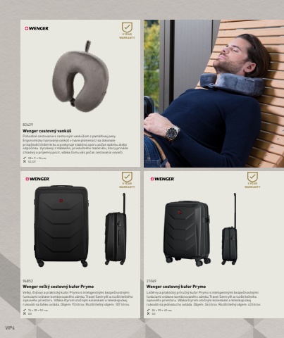 VIP45 YEARWARRANTY5 YEARWARRANTY5 YEARWARRANTY82629Wenger cestovn%u00fd vank%u00fa%u0161Pohodln%u00e9 cestovanie s cestovn%u00fdm vank%u00fa%u0161om z pam%u00e4%u0165ovej peny. Ergonomicky tvarovan%u00fd vank%u00fa%u0161 v tvare p%u00edsmena U sa dokonale prisp%u00f4sob%u00ed l%u00edni%u00e1m krku a poskytuje stabiln%u00fa oporu po%u010das sp%u00e1nku alebo odpo%u010dinku. Vyroben%u00fd z m%u00e4kk%u00e9ho, priedu%u0161n%u00e9ho materi%u00e1lu, ktor%u00fd prin%u00e1%u0161a chladiv%u00fd a pr%u00edjemn%u00fd pocit, v%u010faka %u010domu v%u00e1s po%u010das cestovania osvie%u017ei.28 %u00d7 9 %u00d7 26 cmS2,DT21069Wenger cestovn%u00fd kufor PrymoLe%u017e%u00e9rny a praktick%u00fd pr%u00edru%u010dn%u00fd kufor Prymo s inteligentn%u00fdmi bezpe%u010dnostn%u00fdmi funkciami vr%u00e1tane kombinovan%u00e9ho z%u00e1mku Travel Sentry%u00ae a roz%u0161%u00edrite%u013en%u00e9ho zipsov%u00e9ho priestoru. V%u010faka %u0161tyrom oto%u010dn%u00fdm kolieskam a teleskopickej rukov%u00e4ti sa jednoducho ovl%u00e1da. Objem: 36 litrov. Roz%u0161%u00edrite%u013en%u00fd objem: 43 litrov.55 %u00d7 20 %u00d7 40 cmG396852Wenger ve%u013ek%u00fd cestovn%u00fd kufor PrymoVe%u013ek%u00fd, %u0161t%u00fdlov%u00fd a praktick%u00fd kufor Prymo s inteligentn%u00fdmi bezpe%u010dnostn%u00fdmi funkciami vr%u00e1tane kombinovan%u00e9ho z%u00e1mku Travel Sentry%u00ae a roz%u0161%u00edrite%u013en%u00e9ho zipsov%u00e9ho priestoru. V%u010faka %u0161tyrom oto%u010dn%u00fdm kolieskam a teleskopickej rukov%u00e4ti sa %u013eahko ovl%u00e1da. Objem: 93 litrov. Roz%u0161%u00edrite%u013en%u00fd objem: 107 litrov.76 %u00d7 30 %u00d7 52 cmG3