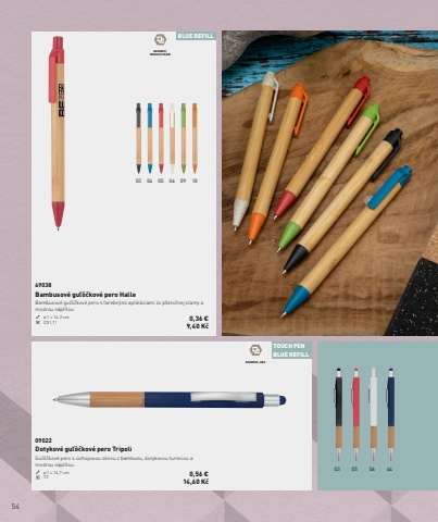 5410090605040344060503BLUE REFILLTOUCH PENBLUE REFILLBAMBOO, WHEATSTRAWBAMBOO, ABS09022Dotykov%u00e9 gu%u013e%u00f4%u010dkov%u00e9 pero TripoliGu%u013e%u00f4%u010dkov%u00e9 pero s %u00fachopovou z%u00f3nou z bambusu, dotykovou funkciou a modrou n%u00e1pl%u0148ou.%u00f8 1 %u00d7 14,7 cm T2 0,56 %u20ac14,60 K%u010d69038Bambusov%u00e9 gu%u013e%u00f4%u010dkov%u00e9 pero HalleBambusov%u00e9 gu%u013e%u00f4%u010dkov%u00e9 pero s farebn%u00fdmi aplik%u00e1ciami zo p%u0161eni%u010dnej slamy a modrou n%u00e1pl%u0148ou.%u00f8 1 %u00d7 14,2 cm CG1,T1 0,36 %u20ac 9,40 K%u010d
