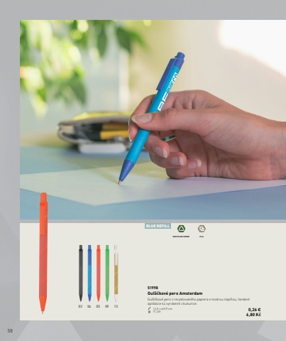 581309050403BLUE REFILLRECYCLED PAPER PLA51998Gu%u013e%u00f4%u010dkov%u00e9 pero AmsterdamGu%u013e%u00f4%u010dkov%u00e9 pero z recyklovan%u00e9ho papiera s modrou n%u00e1pl%u0148ou, farebn%u00e9 aplik%u00e1cie s%u00fa vyroben%u00e9 z kukurice.14,5 %u00d7 %u00f8 0,9 cm T1,UV 0,26 %u20ac 6,80 K%u010d