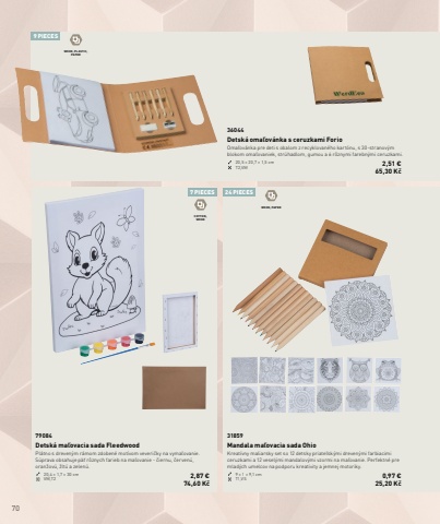 709 PIECES7 PIECES 24 PIECESWOOD, PLASTIC, PAPERWOOD, PAPERCOTTON, WOOD36044Detsk%u00e1 oma%u013eov%u00e1nka s ceruzkami ForioOma%u013eov%u00e1nka pre deti s obalom z recyklovan%u00e9ho kart%u00f3nu, s 30-stranov%u00fdm blokom oma%u013eovaniek, str%u00fahadlom, gumou a 6 r%u00f4znymi farebn%u00fdmi ceruzkami.20,5 %u00d7 20,7 %u00d7 1,5 cm T2,VM 2,51 %u20ac65,30 K%u010d31859Mandala ma%u013eovacia sada OhioKreat%u00edvny maliarsky set so 12 detsky priate%u013esk%u00fdmi dreven%u00fdmi farbiacimi ceruzkami a 12 vesel%u00fdmi mandalov%u00fdmi vzormi na ma%u013eovanie. Perfektn%u00e9 pre mlad%u00fdch umelcov na podporu kreativity a jemnej motoriky.9 %u00d7 1 %u00d7 9,1 cm T1,VS 0,97 %u20ac25,20 K%u010d79084Detsk%u00e1 ma%u013eovacia sada FleedwoodPl%u00e1tno s dreven%u00fdm r%u00e1mom zdoben%u00e9 mot%u00edvom veveri%u010dky na vyma%u013eovanie. S%u00faprava obsahuje p%u00e4%u0165 r%u00f4znych farieb na ma%u013eovanie - %u010diernu, %u010derven%u00fa, oran%u017eov%u00fa, %u017elt%u00fa a zelen%u00fa.20,4 %u00d7 1,7 %u00d7 30 cm VM,T2 2,87 %u20ac 74,60 K%u010d