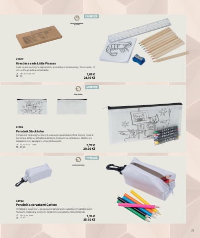 719 PIECES6 PIECES13 PIECESNON-WOVENPAPER, BASSWOOD, PLASTICPOLYESTER, WOOD48933Pera%u010dn%u00edk s ceruzkami CarltonPera%u010dn%u00edk z polyesteru so zipsov%u00fdm zatv%u00e1ran%u00edm a plastov%u00fdm karab%u00ednov%u00fdm h%u00e1%u010dikom, dod%u00e1van%u00fd s %u00f4smimi farebn%u00fdmi ceruzkami r%u00f4znych farieb.10 %u00d7 5,5 %u00d7 5 cm DT,S2 1,36 %u20ac35,40 K%u010d61104Pera%u010dn%u00edk StockholmPera%u010dn%u00edk z netkanej text%u00edlie s 5 voskov%u00fdmi pastelkami (%u017elt%u00e1, %u010dierna, modr%u00e1, %u010derven%u00e1 a zelen%u00e1), potla%u010den%u00fd detsk%u00fdm mot%u00edvom na vyfarbenie. Ide%u00e1lny na zabavenie det%u00ed a podporu ich predstavivosti.23,3 %u00d7 0,5 %u00d7 12 cm DT,S2 0,77 %u20ac20,00 K%u010d21027Kresliaca sada Little PicassoSada na kreslenie pre najmen%u0161%u00edch, pozost%u00e1va z oma%u013eovanky, 10 ceruziek, 15 cm-ov%u00e9ho prav%u00edtka a str%u00fahadla.18 %u00d7 7,5 %u00d7 0,8 cm T2 1,08 %u20ac28,10 K%u010d