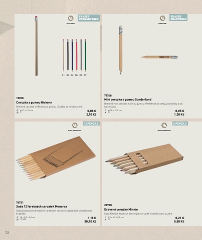 7201 04 05 03 0907ERASER SHARPENEDERASER UNSHARPENED12 PENCILS 6 PENCILSBASS WOOD BASS WOODWOOD, CARDBOARD WOOD, CARDBOARD74731Sada 12 farebn%u00fdch ceruziek MenorcaSada dvan%u00e1stich dreven%u00fdch farebn%u00fdch ceruziek zabalen%u00fdch v kart%u00f3novej krabi%u010dke.18 %u00d7 8,9 %u00d7 0,8 cm T2,VM 1,18 %u20ac30,70 K%u010d28970Dreven%u00e9 ceruzky MinnieSada %u0161iestich kr%u00e1tkych dreven%u00fdch ceruziek v kart%u00f3novom puzdre.9,3 %u00d7 4,9 %u00d7 0,9 cm T1 0,21 %u20ac5,50 K%u010d19810Ceruzka s gumou HickoryDreven%u00e1 ceruzka s HB tuhou a gumou. Dod%u00e1va sa nenaostren%u00e1.%u00f8 0,7 %u00d7 19,1 cm T1 0,08 %u20ac 2,10 K%u010d71768Mini ceruzka s gumou SunderlandDreven%u00e1 mini ceruzka s bielou gumou. Perfektn%u00e1 na cesty, pozn%u00e1mky a ski na ceruzku.%u00f8 0,8 %u00d7 10,2 cm T1 0,05 %u20ac 1,30 K%u010d