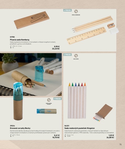 756 PIECES6 PIECES7 PIECESWOOD, CARDBOARDWAX, PAPERPAPER, WOOD, PLASTIC01750P%u00edsacia sada HamburgSada na p%u00edsanie a kreslenie s 3 ceruzkami s r%u00f4znym stup%u0148om tvrdosti, prav%u00edtkom, gumou a str%u00fahadlom.17,8 %u00d7 5 %u00d7 1,2 cm T2 0,90 %u20ac23,40 K%u010d39224Dreven%u00e9 ceruzky BeckyKart%u00f3nov%u00e1 krabi%u010dka obsahuj%u00faca %u0161es%u0165 kr%u00e1tkych hrub%u00fdch farebn%u00fdch ceruziek s integrovan%u00fdm str%u00fahadlom a modr%u00fdm prieh%u013eadn%u00fdm plastov%u00fdm vie%u010dkom.%u00f8 2,7 %u00d7 10 cm T1 0,41 %u20ac10,70 K%u010d54331Sada voskov%u00fdch pasteliek KingstonSada %u0161iestich voskov%u00fdch pasteliek v r%u00f4znych farb%u00e1ch so %u0161peci%u00e1lnym nekone%u010dn%u00fdm jadrom z TPR materi%u00e1lu. Tieto voskov%u00e9 pastelky s%u00fa stierate%u013en%u00e9.9 %u00d7 5 %u00d7 1 cm T2,VM 1,03 %u20ac26,80 K%u010d