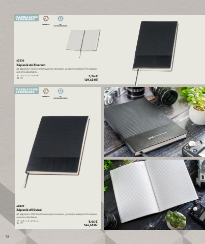 78FLEXIBLE COVER2 BOOKMARKSFLEXIBLE COVER2 BOOKMARKSPAPER, PU A6, 160 SQUARED PAGESPAPER, PU A5, 200 SQUARED PAGES40539Z%u00e1pisn%u00edk A5 DubaiA5 z%u00e1pisn%u00edk s 200 %u0161tvor%u010dekovan%u00fdmi stranami, pru%u017en%u00fdm m%u00e4kk%u00fdm PU obalom a dvoma z%u00e1lo%u017ekami.14,8 %u00d7 1,5 %u00d7 21,3 cm T2 5,64 %u20ac146,60 K%u010d62336Z%u00e1pisn%u00edk A6 ElverumA6 z%u00e1pisn%u00edk s 160 %u0161tvor%u010dekovan%u00fdmi stranami, pru%u017en%u00fdm m%u00e4kk%u00fdm PU obalom a dvoma z%u00e1lo%u017ekami.10,2 %u00d7 1,3 %u00d7 14,6 cm T2 5,36 %u20ac 139,40 K%u010d