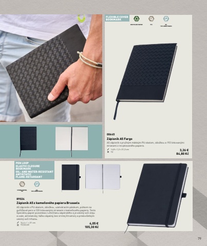 79FLEXIBLE COVERBOOKMARKPEN LOOPELASTIC CLOSUREBOOKMARKOIL- AND WATER-RESISTANTANTISTATICFLAME-RETARDANTRECYCLED PAPER PU A5, 192 LINED PAGESSTONE PAPER, PUA5, 120 LINED PAGES00645Z%u00e1pisn%u00edk A5 FargoA5 z%u00e1pisn%u00edk s pru%u017en%u00fdm m%u00e4kk%u00fdm PU obalom, z%u00e1lo%u017ekou a 192 linkovan%u00fdmi stranami z recyklovan%u00e9ho papiera.14,8 %u00d7 1,2 %u00d7 21,2 cm T2 3,26 %u20ac 84,80 K%u010d89024Z%u00e1pisn%u00edk A5 z kame%u0148ov%u00e9ho papiera BrusselsA5 z%u00e1pisn%u00edk s PU obalom, z%u00e1lo%u017ekou, uzatv%u00e1rac%u00edm p%u00e1sikom, p%u00fatkom na gu%u013e%u00f4%u010dkov%u00e9 pero a 120 linkovan%u00fdmi stranami z kame%u0148ov%u00e9ho papiera. Tento %u0161peci%u00e1lny papier pozost%u00e1va z uhli%u010ditanu v%u00e1penat%u00e9ho a je odoln%u00fd vo%u010di oleju a vode, antistatick%u00fd, %u0165a%u017eko z%u00e1paln%u00fd, bez zrnitej %u0161trukt%u00fary a predov%u0161etk%u00fdm odoln%u00fd vo%u010di trhaniu.14,4 %u00d7 1 %u00d7 21 cm T2,S2,UV 4,05 %u20ac 105,30 K%u010d
