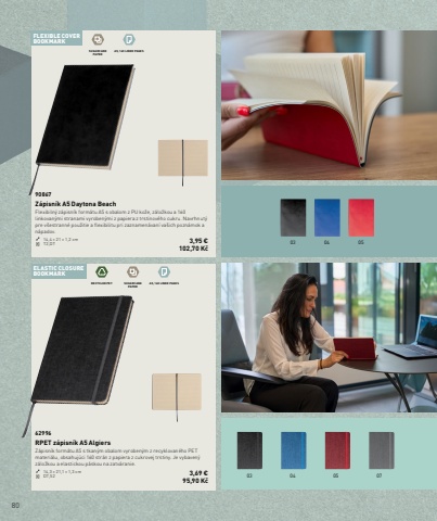8003 04 0503 04 05 07FLEXIBLE COVERBOOKMARKELASTIC CLOSUREBOOKMARKSUGARCANEPAPERA5, 160 LINED PAGESRECYCLED PET SUGARCANEPAPERA5, 160 LINED PAGES90867Z%u00e1pisn%u00edk A5 Daytona BeachFlexibiln%u00fd z%u00e1pisn%u00edk form%u00e1tu A5 s obalom z PU ko%u017ee, z%u00e1lo%u017ekou a 160 linkovan%u00fdmi stranami vyroben%u00fdmi z papiera z trstinov%u00e9ho cukru. Navrhnut%u00fd pre v%u0161estrann%u00e9 pou%u017eitie a flexibilitu pri zaznamen%u00e1van%u00ed va%u0161ich pozn%u00e1mok a n%u00e1padov.14,4 %u00d7 21 %u00d7 1,2 cm T2,DT 3,95 %u20ac102,70 K%u010d62996RPET z%u00e1pisn%u00edk A5 AlgiersZ%u00e1pisn%u00edk form%u00e1tu A5 s tkan%u00fdm obalom vyroben%u00fdm z recyklovan%u00e9ho PET materi%u00e1lu, obsahuj%u00faci 160 str%u00e1n z papiera z cukrovej trstiny. Je vybaven%u00fd z%u00e1lo%u017ekou a elastickou p%u00e1skou na zatv%u00e1ranie.14,3 %u00d7 21,1 %u00d7 1,3 cm DT,S2 3,69 %u20ac95,90 K%u010d
