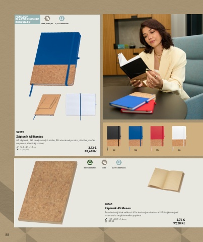 8803 04 05 06PEN LOOPELASTIC CLOSUREBOOKMARK CORK, PAPER, PU A6, 160 LINED PAGESRECYCLED PAPER CORK A5, 192 LINED PAGES48745Z%u00e1pisn%u00edk A5 MesenPozn%u00e1mkov%u00fd blok ve%u013ekosti A5 s korkov%u00fdm obalom a 192 linajkovan%u00fdmi stranami z recyklovan%u00e9ho papiera.13,9 %u00d7 20,9 %u00d7 1,6 cm DT,S2 3,74 %u20ac97,20 K%u010d56959Z%u00e1pisn%u00edk A5 NantesA5 z%u00e1pisn%u00edk, 160 linajkovan%u00fdch str%u00e1n, PU a korkov%u00e9 puzdro, z%u00e1lo%u017eka, slu%u010dka na pero a elastick%u00fd uz%u00e1ver.14,3 %u00d7 21 %u00d7 1,8 cm T2,DT,UV 3,13 %u20ac81,40 K%u010d