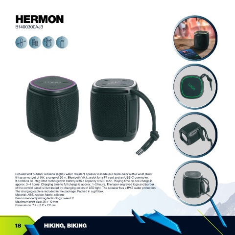 of the control panel is illuminated by changing colors of LED light. The speaker has a IPX5 water protection. Multifunctional Schwarzwolf spoon includes a knife and its end with teeth can be used as a fork, together