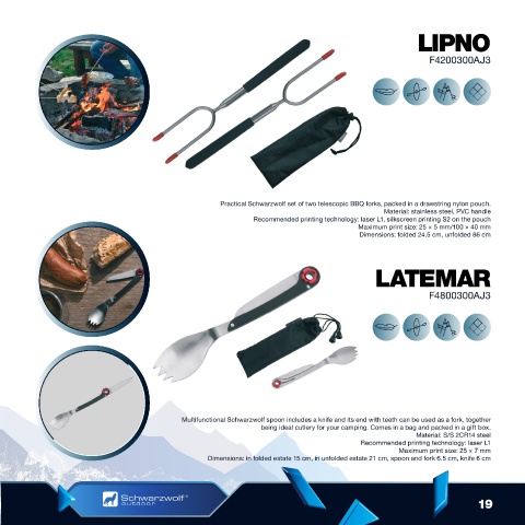 of the control panel is illuminated by changing colors of LED light. The speaker has a IPX5 water protection. Multifunctional Schwarzwolf spoon includes a knife and its end with teeth can be used as a fork, together