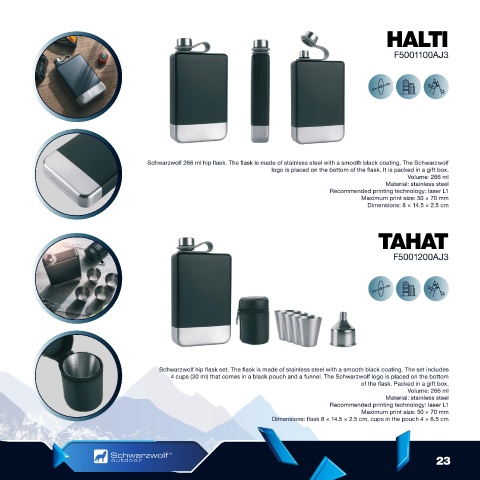 Dimensions: flask 9.5 × 14.6 × 2.5 cm, cups in the pouch 4 × 6.5 cm Dimensions: flask 8 × 14.5 × 2.5 cm, cups in the pouch 4 × 6.5 cm