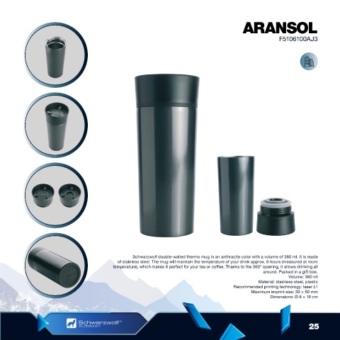 Schwarzwolf double-walled thermo mug in a black color with a volume of 240 ml, which is Schwarzwolf double-walled thermo mug in an anthracite color with a volume of 360 ml. It is made