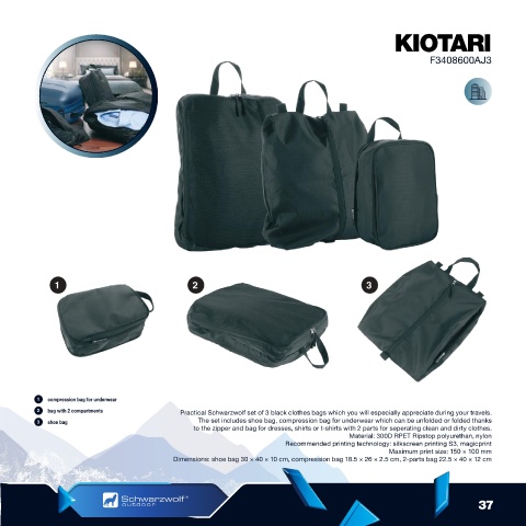 Volume: 20 l  5  strap to attach to the suitcase  3  shoe bag  The set includes shoe bag, compression bag for underwear which can be unfolded or folded thanks
