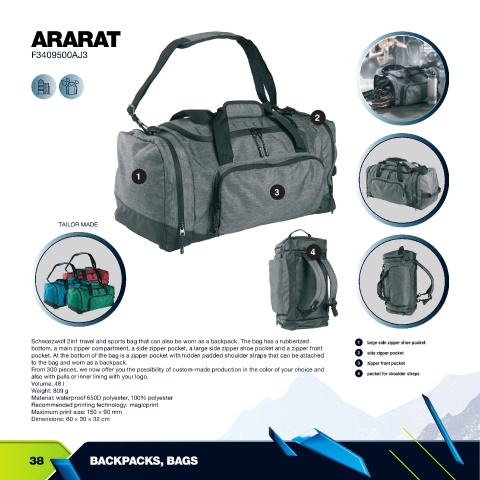 Schwarzwolf 2in1 travel and sports bag that can also be worn as a backpack. The bag has a rubberized   1  large side zipper shoe pocket