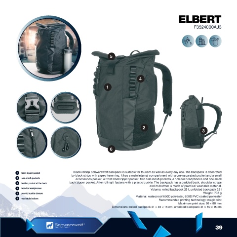bottom, a main zipper compartment, a side zipper pocket, a large side zipper shoe pocket and a zipper front   1  front zipper pocket  Black rolltop Schwarzwolf backpack is suitable for tourism as well as every day use. The backpack is decorated