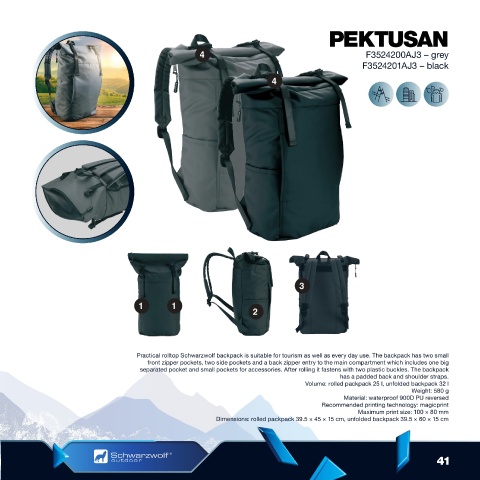includes one big separated pocket and small pockets for accessories. After rolling it fastens with two plastic buckles.   2  side pockets  Practical rolltop Schwarzwolf backpack is suitable for tourism as well as every day use. The backpack has two small