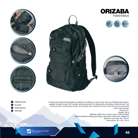 pockets, front pocket with buckle closing, middle zipper pocket with compartments for small items   1  walking stick holder  Practical Schwarzwolf backpack is suitable for travelling as well as every day use. Padded back system,