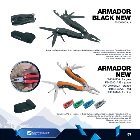 Schwarzwolf 13-in-1 mini multitool in a black neoprene pouch. Packed in a gift box. Schwarzwolf 15-in-1 multitool with safety lock in a black neoprene pouch. Packed in a gift box.