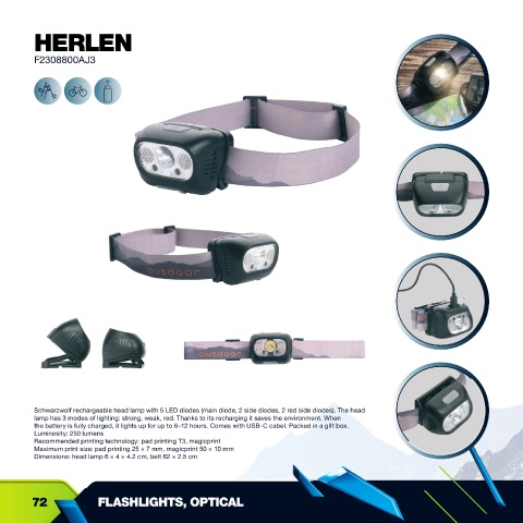 Dimensions: head lamp 6 × 4 × 4.2 cm, belt 62 × 2.5 cm Baterries 4 × AAA included