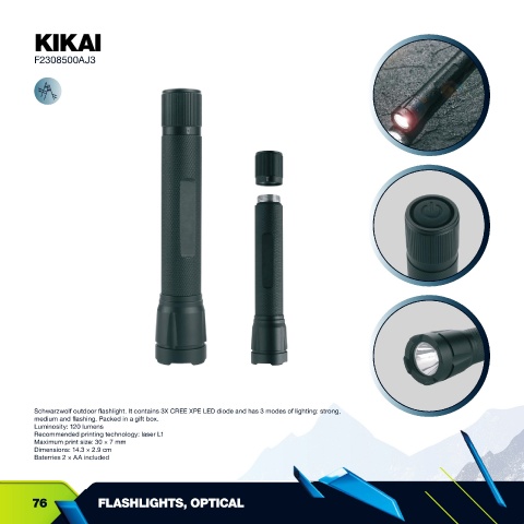 Schwarzwolf outdoor flashlight. It contains 3X CREE XPE LED diode and has 3 modes of lighting: strong, Schwarzwolf outdoor flashlight with a wrist strap. It contains 5W Osram LED diode and ZOOM function.